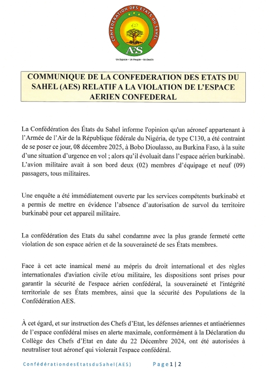 La Confédération des États du Sahel (AES) informe l’opinion publique qu’un avion militaire C130 de l’Armée de l’Air du Nigéria a été contraint d’atterrir ce 08 décembre 2025 à Bobo Dioulasso, au Burkina Faso, après avoir pénétré illégalement l’espace aérien confédéral.
