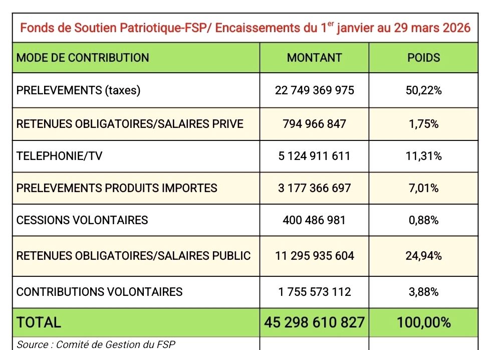 Le Comité de gestion du Fonds de Soutien Patriotique (FSP) a rendu publics les chiffres de mobilisation des ressources pour la période du 1er janvier au 29 mars 2026. Au total, 45 298 610 827 FCFA ont été mobilisés, soit 22,65 % de l’objectif annuel fixé à 200 milliards de FCFA.