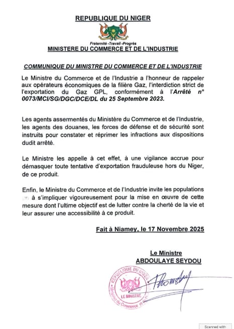 Le ministère du Commerce et de l’Industrie du Niger a réaffirmé, dans un communiqué publié le 17 novembre 2025 à Niamey, l’interdiction formelle d’exporter du gaz GPL. Cette mesure découle de l’Arrêté n°0073/MCI/SG/DGC/DCE/DL du 25 septembre 2023, qui encadre strictement la filière afin de garantir la disponibilité du produit sur le territoire national.