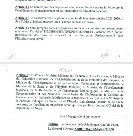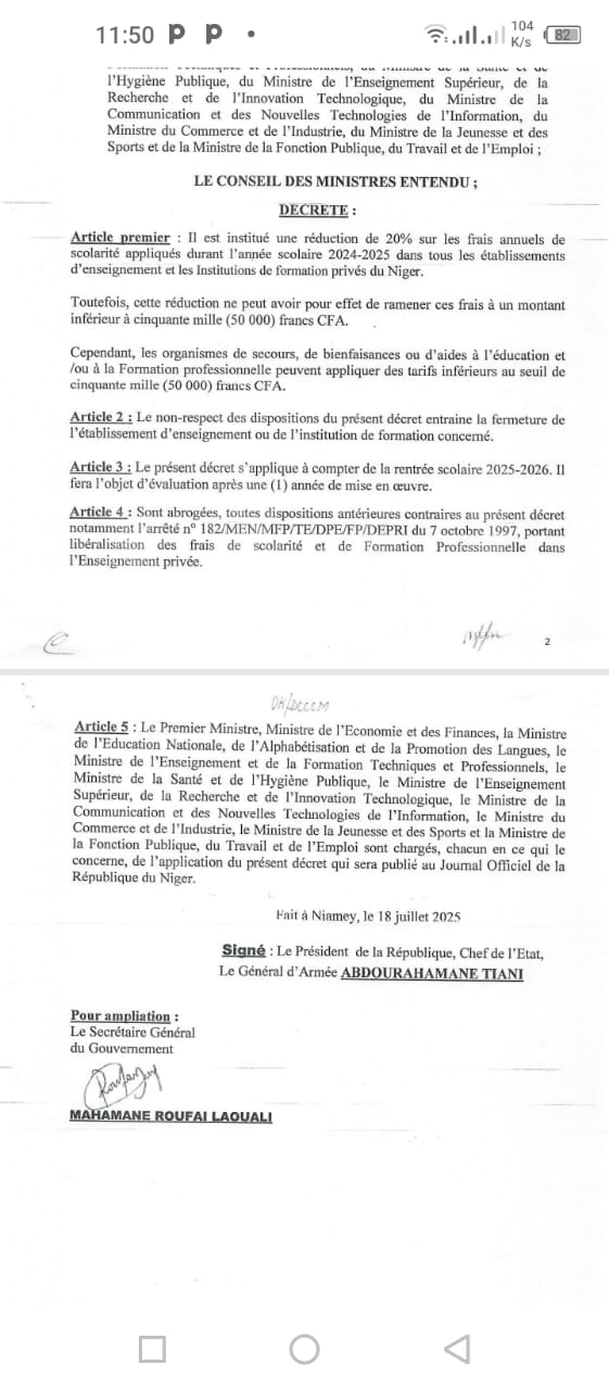 Le Président de la République, Chef de l’État, le Général d’Armée Abdourahmane Tiani, a signé un décret le 18 juillet 2025 instaurant une réduction de 20 % sur les frais annuels de scolarité dans tous les établissements et institutions de formation privés du pays.