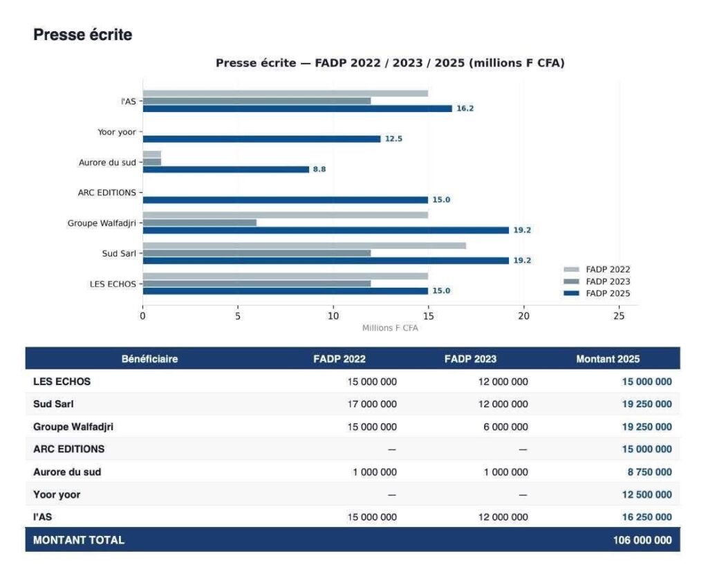 La presse écrite, quant à elle, reçoit 106 millions FCFA. Le Groupe Walfadjri et Sud Quotidien perçoivent chacun 19,25 millions FCFA, tandis que L’AS obtient 16,25 millions FCFA.