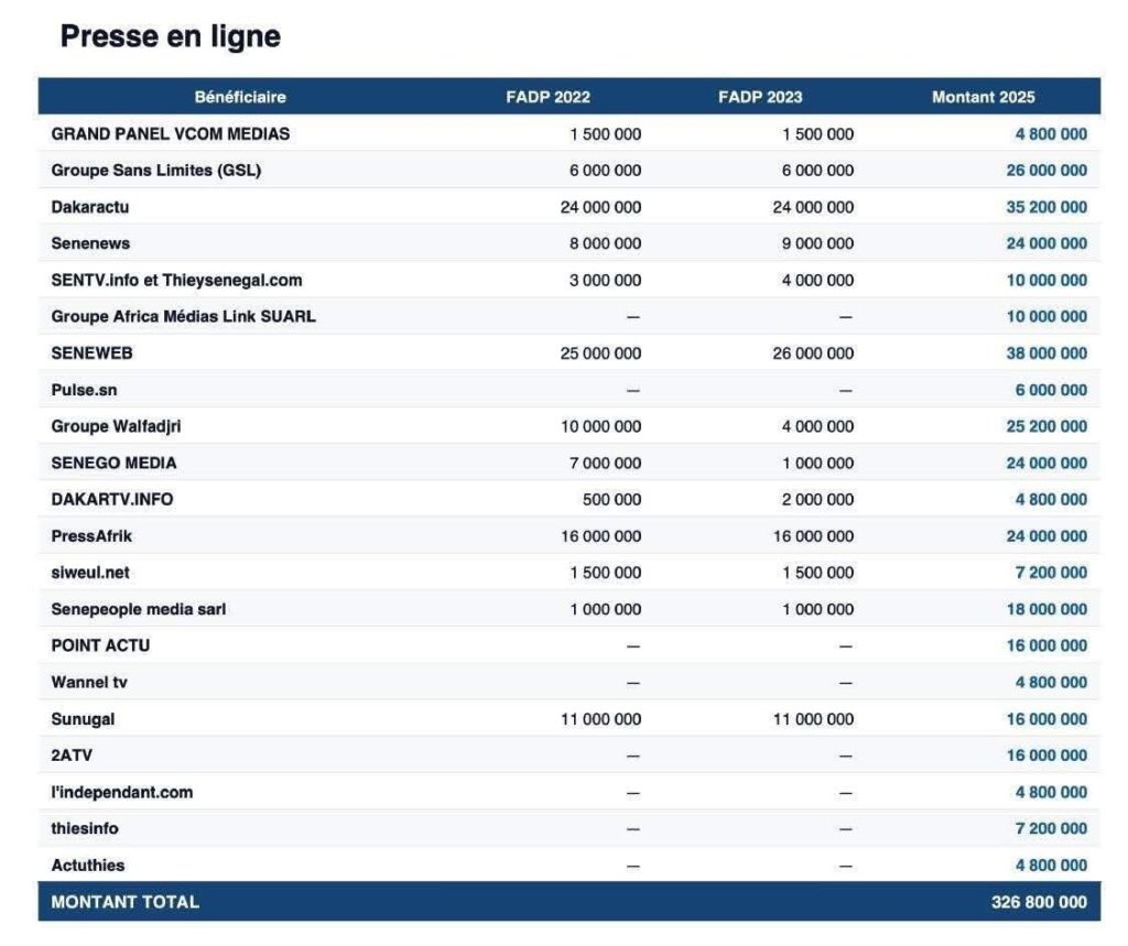 La presse en ligne capte la plus grande part avec 326,8 millions FCFA. Seneweb (38 millions FCFA) et Dakaractu (35,2 millions FCFA) figurent en tête, suivis du Groupe Sans Limites (26 millions), Senenews (24 millions) et PressAfrik (24 millions).