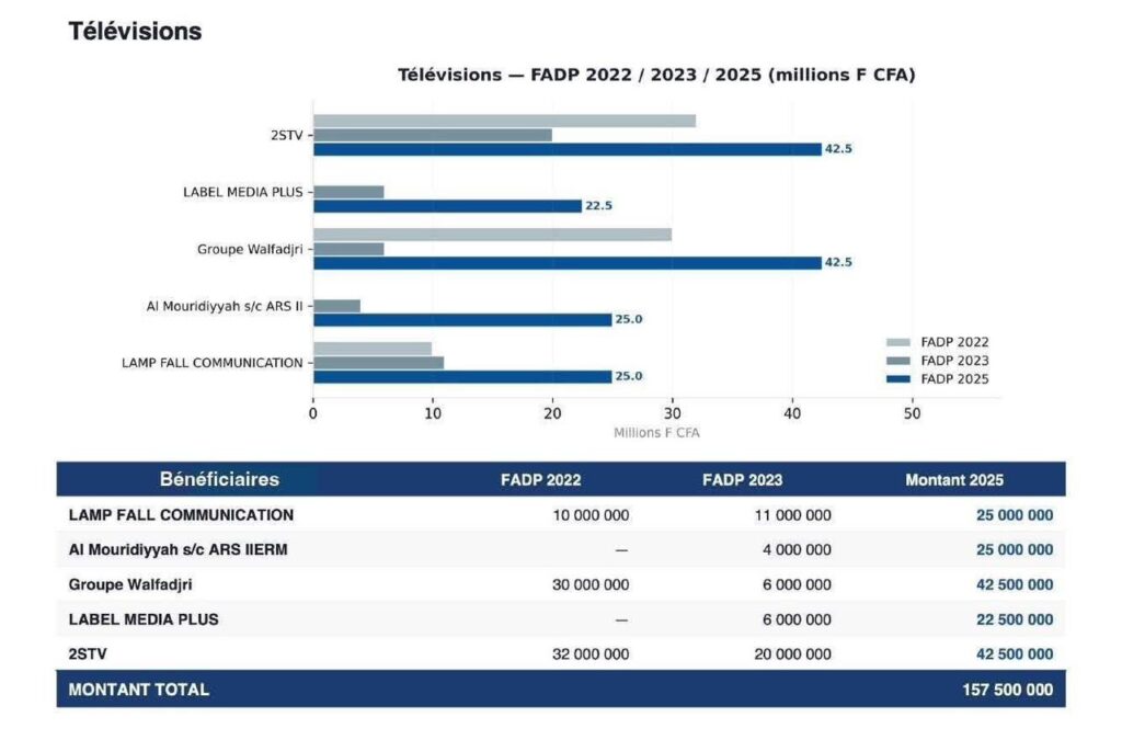 Les télévisions bénéficient d’une enveloppe globale de 157,5 millions FCFA. Les groupes 2STV et Walfadjri TV arrivent en tête avec 42,5 millions FCFA chacun, suivis d’Al Mouridiyyah (25 millions), LAMP FALL Communication (25 millions) et Label Media Plus (22,5 millions).