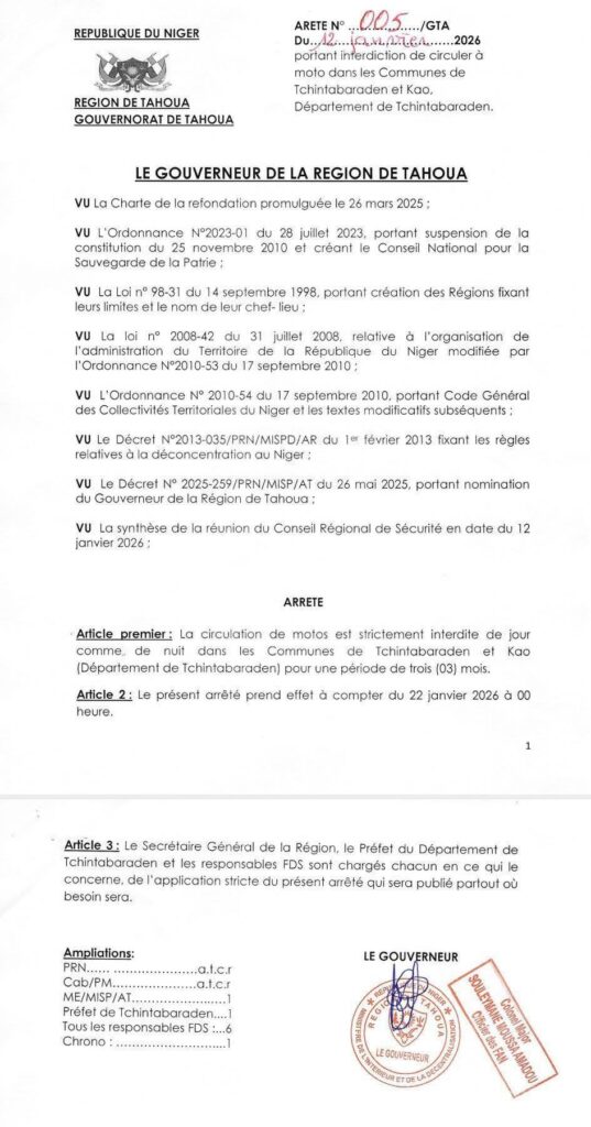 Par arrêté du Gouverneur de la région de Tahoua le Colonel-Major Souleymane Amadou Moussa du 12 janvier 2026, la circulation des motos dans les communes de Tchintabaraden et Kao est interdite pour une période de 3 mois à compter du 22 janvier.